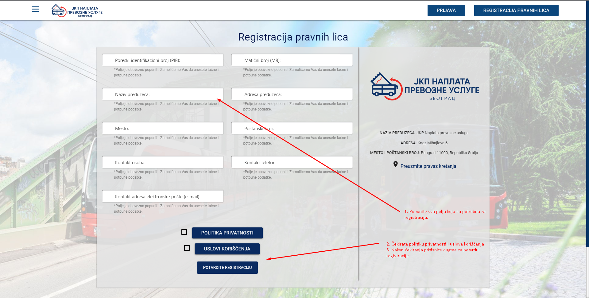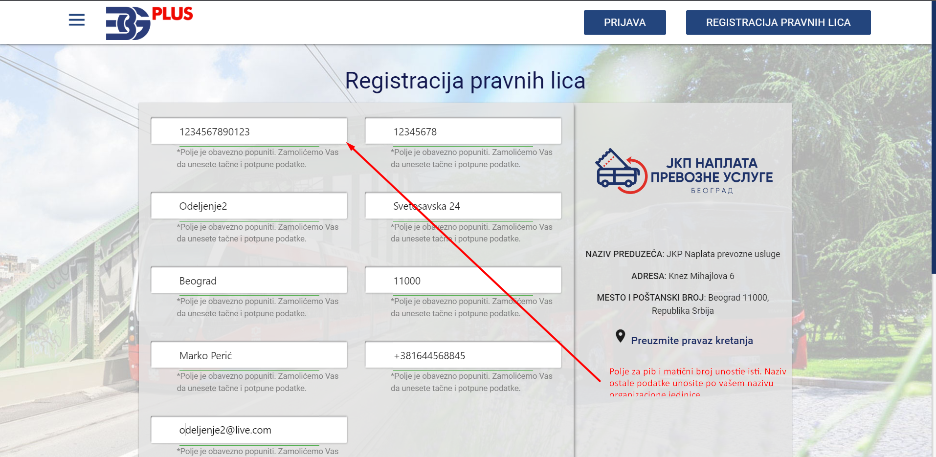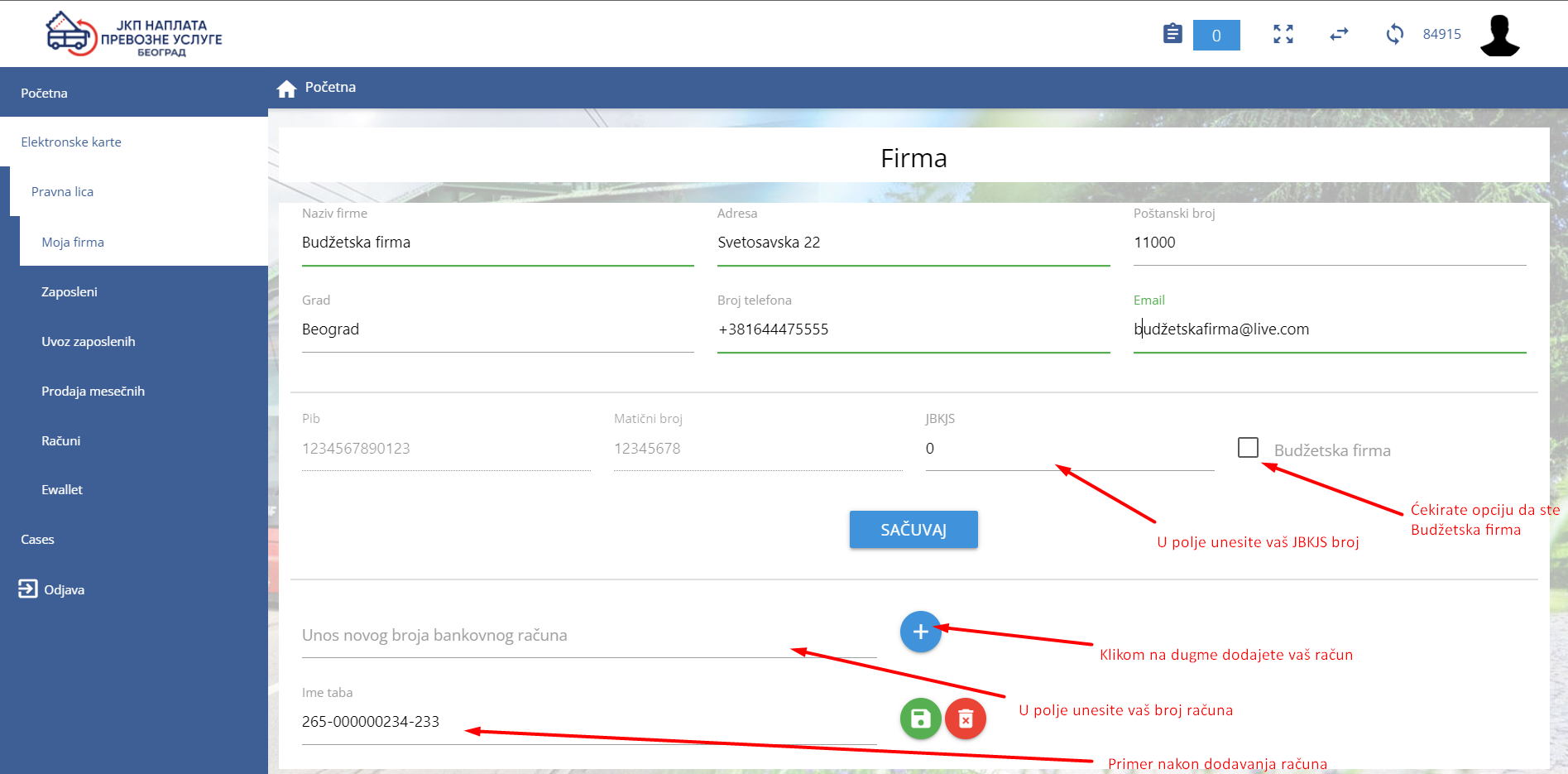 У горе наведеним сликама је презентација регистрације буџетцкиx корисника са више од једне организационе јединице (ЈБКЈС број). Након успешне регистрације на мејл са којим сте се регистровали добићете корисницко име и лозинку за пријаву на протал. Након пријаве потребно је да уђете у секцију електронске карте -> Правна лица -> Моја фирма и подесите ваш ЈБКЈС број и ваш банковни рачун.